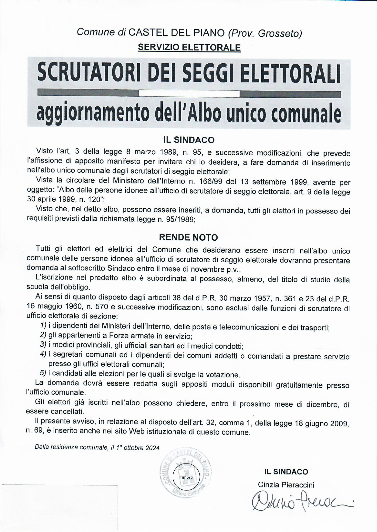 Si comunica a tutti i cittadini residenti nel Comune di Castel del Piano che qualora fossero interessati ad essere iscritti nell'albo degli scrutatori dell'ente devono presentare al protocollo il modulo di domanda di seguito scaricabile unitamente ad un documento di riconoscimento: